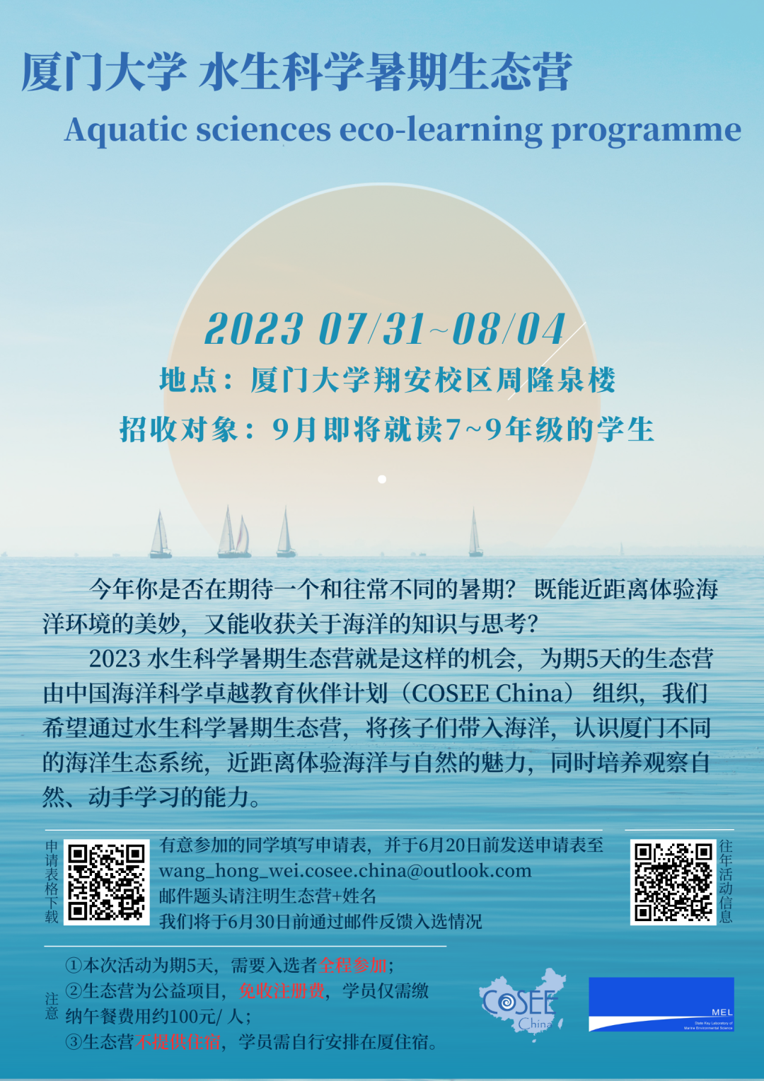 厦门大学水生科学暑期生态营是COSEE China的品牌项目之一。我们期望通过联系科学家、志愿者和夏令营员,激发志愿者和营员对海洋科学与环境保护的热情,同时使志愿者和营员成为家庭、学校乃至社会中传播海洋科学的行动者。