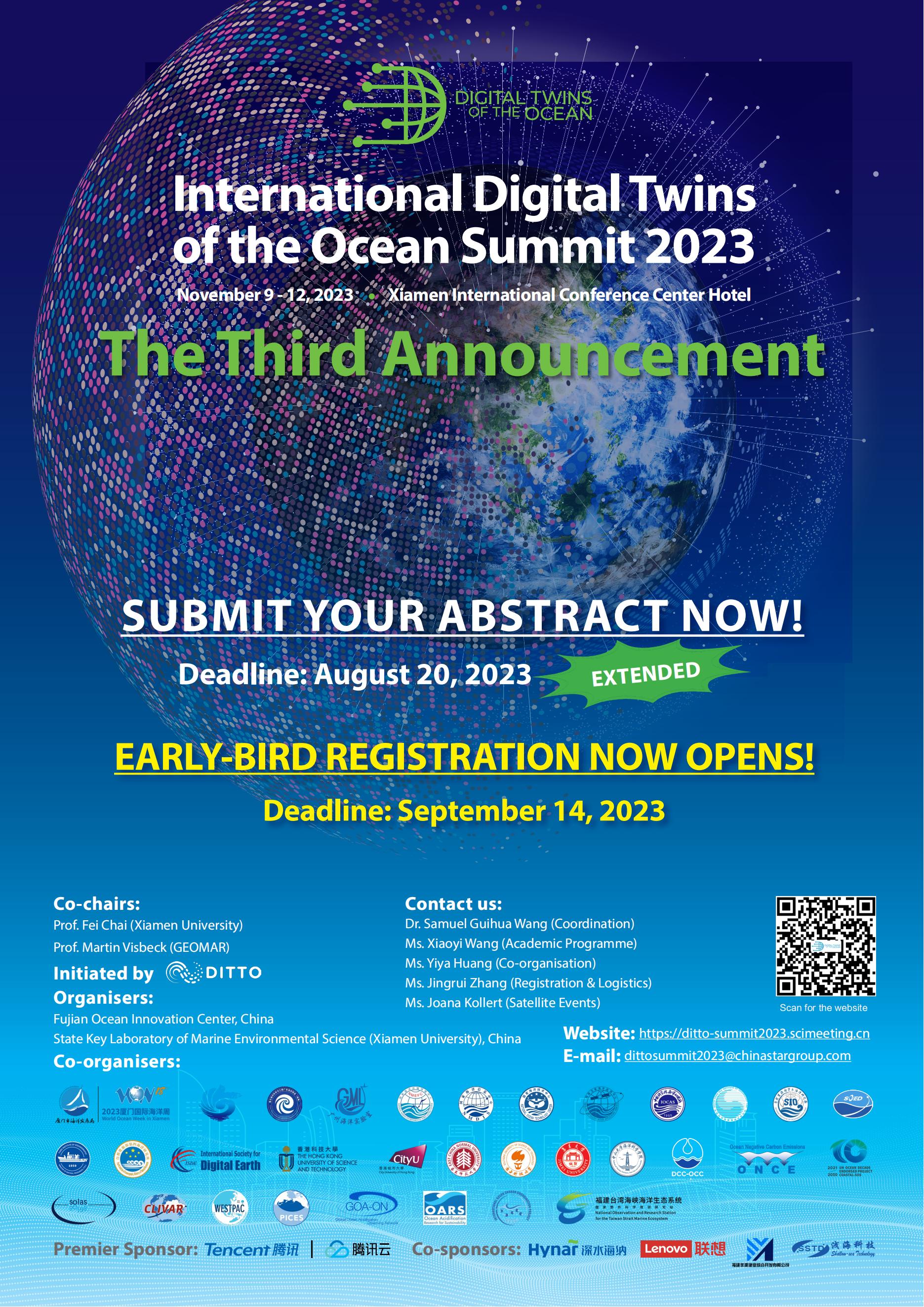 Taking the great arena of 2023 World Ocean Week in Xiamen, the DITTO Summit 2023 will be co-organised by the Fujian Ocean Innovation Center and State Key Laboratory of Marine Environmental Science (Xiamen University), and to gather global participants with themes focusing on sharing the latest knowledge about DTOs and discussing future actions on advancing and applying them.