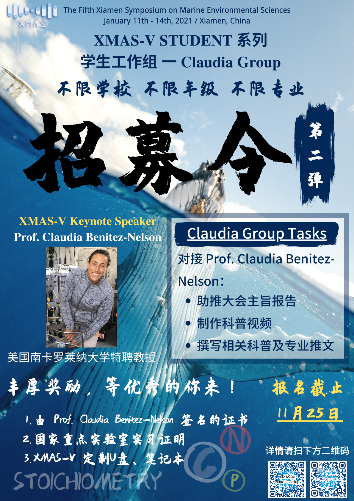 本届XMAS特设学生工作组(XMAS-STUDENT)若干,参与活动策划与宣传,旨在让学生与世界知名海洋学家交流合作,提升自身专业素养,深化认知,并向公众普及海洋研究的重要性。其中,Claudia Group主要负责与主旨报告演讲人(Keynote Speaker)Claudia Benitez-Nelson教授配合共同宣传如何更好地利用元素的化学计量学来理解海洋中有机物的变化过程。