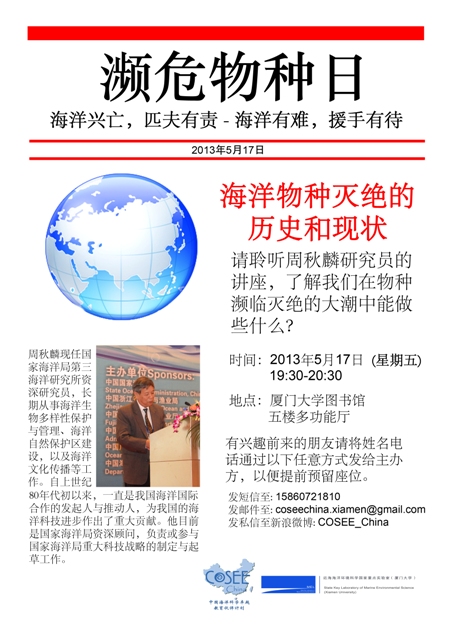 5月17日是濒危物种日,借此机会,近海海洋环境科学国家重点实验室与中国海洋科学卓越教育伙伴计划邀请周秋麟研究员前来讲座,意在让更多人了解海洋濒危物种的故事,了解我们在物种濒临灭绝的大潮中能做什么。