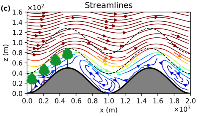 【平缓起伏地形上的植被冠层中的过山气流。注意地形背风面会形成明显的气流回流区,在地表附近可将山底物质输送至山顶。】