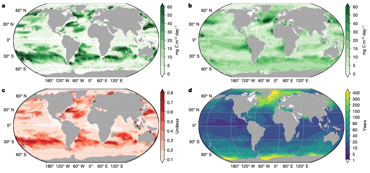2. Marine Biological Pump: Dr. Wang developed an three-dimensional phosphorus-carbon-oxygen coupled inverse model (BGCIMv1), which successfully derived the global oceanic biological pump fluxes driven by multiple processes. His work reconciled the contradiction between total carbon output and carbon demand for deep ocean respiration. Additionally, his work quantified the fluxes of the biological pump from the perspective of sequestration time (see Figure 3).