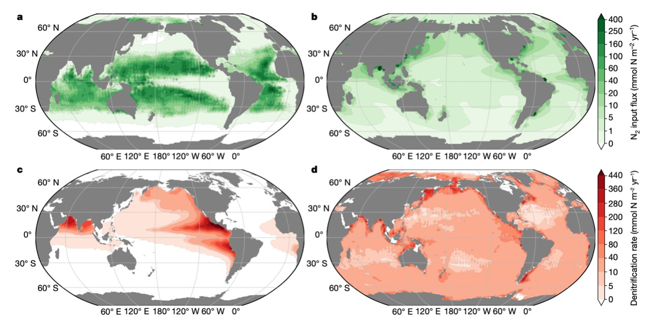 图2、a)固氮速率、b)大气沉降和河流输入、c)水体低氧区反硝化和d)沉积物反硝化速率的分布(Wang et al., 2019 Nature)