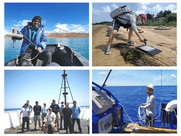 图 1. 余小龙博士参加现场观测航次部分照片。左上,第二次青藏高原综合科学考察(拉昂错,2021年5月);右上,山东荣成天鹅湖海草调查(2022年8月);左下,北大西洋VIIRS卫星Cal/Val航次(2018年5月);右下,西北太平洋Carbon-Fe夏季航次(2020年7月)。