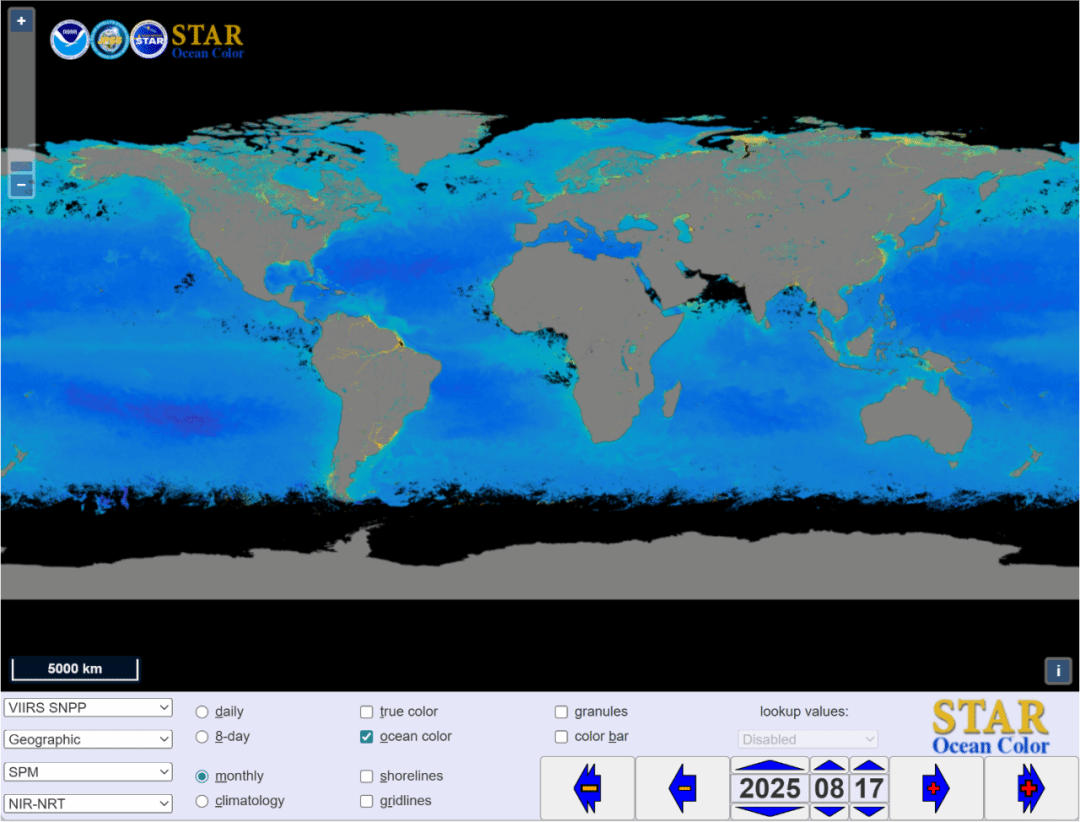 图 2. 余小龙博士研发的悬浮颗粒物浓度(SPM)遥感算法被美国NOAA采纳用于业务化产品发布。图为2025年8月全球水体月平均SPM空间分布图(来自NOAA OCview)。