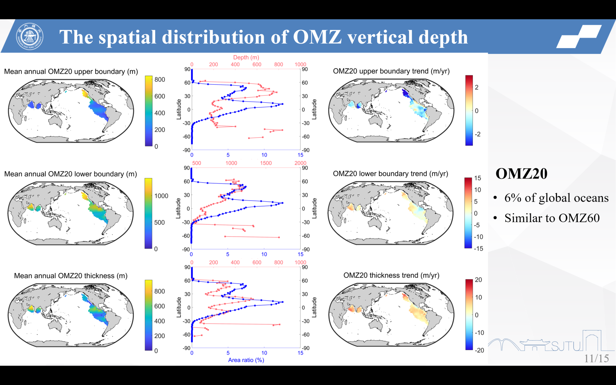 在“海洋生态”专题中,以海洋缺氧和脱氧为研究重心,来自上海交通大学龚红静博士通过报告《气候变化下全球最小含氧带的垂直延伸》指出在气候变化的背景下,观测到全球最小含氧带(OMZ)有明显垂直延伸趋势,未来需要对OMZ作进一步的研究,为海洋生物保护提供科学认识。