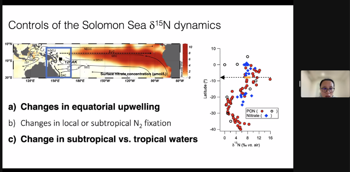 在研究热带南太平洋西部状态时,Dr. Ren先从微观入手,通过观测氮同位素的变化,并结合宏观海洋科学知识,包括ENSO、上升流等,提出生物地球化学循环下环境变化的可能因素。同时Dr. Ren最后呼吁——人为因素导致全球气候变暖是否与此有关,也引发了我的思考,人类原因造成的环境问题绝不是单单一方面的,因此让更多人关注海洋负排放的相关问题刻不容缓。