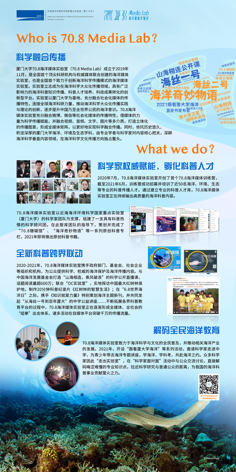 厦门大学70.8海洋媒体实验室(70.8 Media Lab)成立于2019年11月,是全国首个顶尖科研机构与权威媒体联合创建的海洋媒体实验室,也是全国首个致力于创新海洋科学传播模式的海洋媒体实验室。实验室立志成为在海洋科学大众化传播领域,具有广泛影响力的海洋科普知识传播、科普人才培养、科技成果转化的创新型平台。实验室将以厦门大学为基地,充分融合社会化媒体的传播特性,连接全球海洋科研力量,推动海洋科学大众化传播实践与理论的创新,逐步提升中国乃至全世界公民的海洋意识。70.8海洋媒体实验室充分融合微博、微信等社会化媒体的传播特性,借媒体的力量为科学传播赋能,并融合视频、音频、文字、图片等多介质,打造立体化的传播图景,形成全媒体矩阵,以更好地实现科学融合传播。同时,依托历史悠久、积淀深厚的厦门大学海洋、环境及生态学科,由专业学者与科学家对内容倾心把关,深耕海洋科学垂直内容领域,在海洋科学文化传播方向独占鳌头。